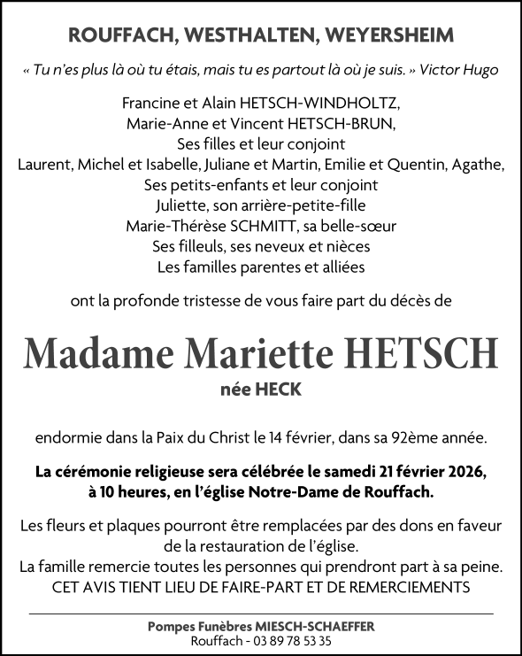 Décédée à Colmar (68000, France) le samedi 14 février 2026 à l'âge de 91 ans