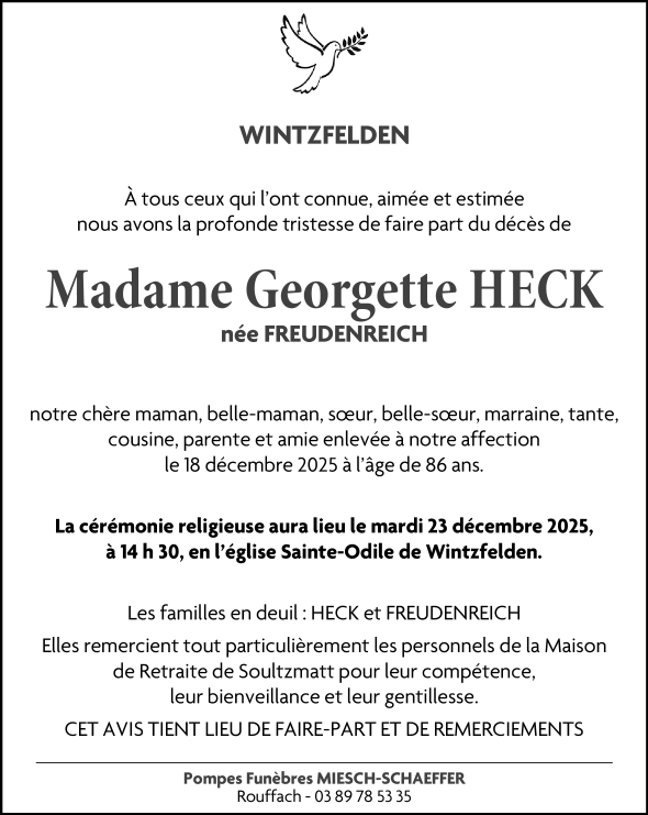 Décédée à Soultzmatt (68570, France) le jeudi 18 décembre 2025 à l'âge de 86 ans