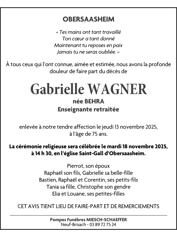 Décédée à Colmar (68000, France) le jeudi 13 novembre 2025 à l'âge de 75 ans