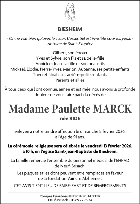 Décédée à Neuf-Brisach (68600, France) le dimanche 8 février 2026 à l'âge de 91 ans
