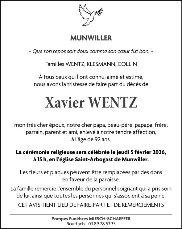 Décédé à Colmar (68000, France) le samedi 31 janvier 2026 à l'âge de 92 ans