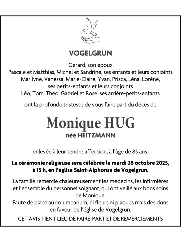 Décédée à Vogelgrun (68600, France) le mardi 21 octobre 2025 à l'âge de 83 ans
